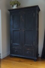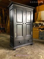 Magnifique armoire antique avec deux portes dans le corps du meuble et deux tiroirs plats au bas. Dix panneaux creux avec moulurations ajoutées. Trois tablettes ajustables sur crémaillères. Présentez-vous à la boutique de l’Atelier du vieux pin pour découvrir nos modèles disponibles. Toutes nos armoires sont confectionnées avec notre quincaillerie décorative et notre procédé de finition à l’ancienne.