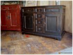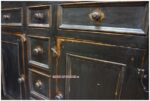 Buffet bas trois sections à deux portes et six tiroirs (2 grands et 4 petits progressifs) dans le corps. Six panneaux creux à mouluration ajoutée. Tiroirs à bordures ajoutées. Présentez-vous à la boutique de l’Atelier du vieux pin pour faire votre choix. Quincaillerie décorative et finition à l’ancienne.