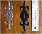 Entrée de serrure avec choix de deux finis;  en fer poli ou noir mat. Peut être utilisée en position horizontale ou verticale pour un montant de porte. Motif de fleurdelisé. Dimensions: 130 mm x 40 mm