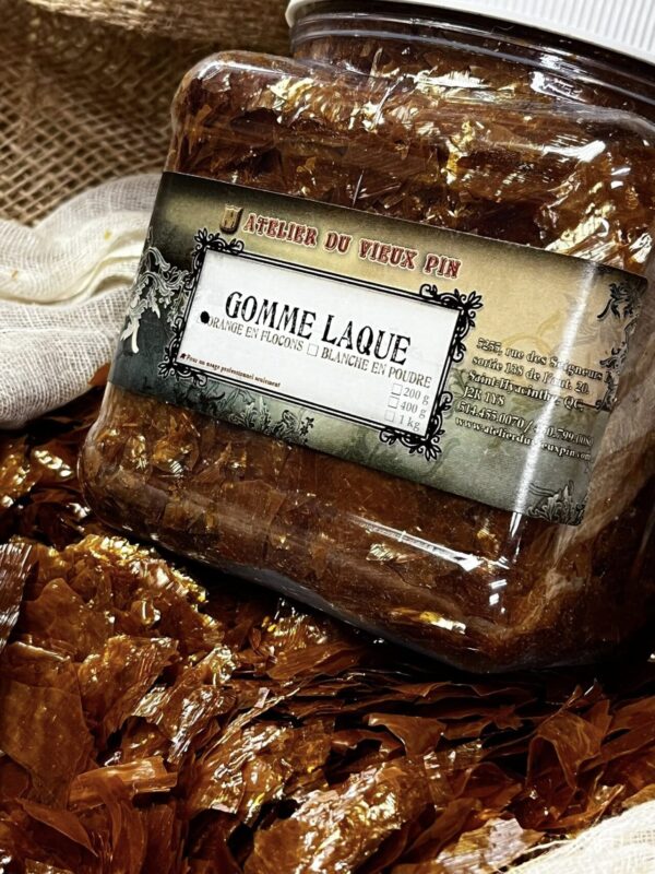 La gomme laque orange en flocons procure un protecteur de teinte ambrée.