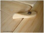 La forme particulière de ce loquet de bois en pin rappelle la silhouette d’une baleine.