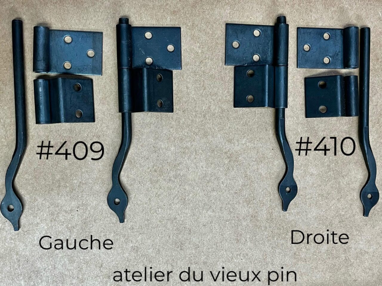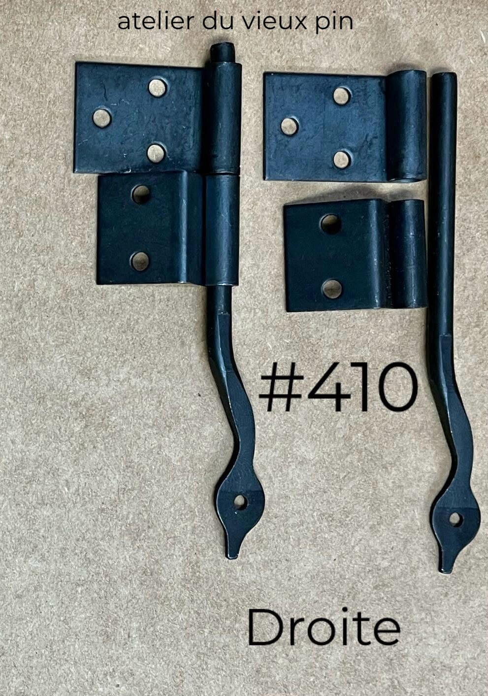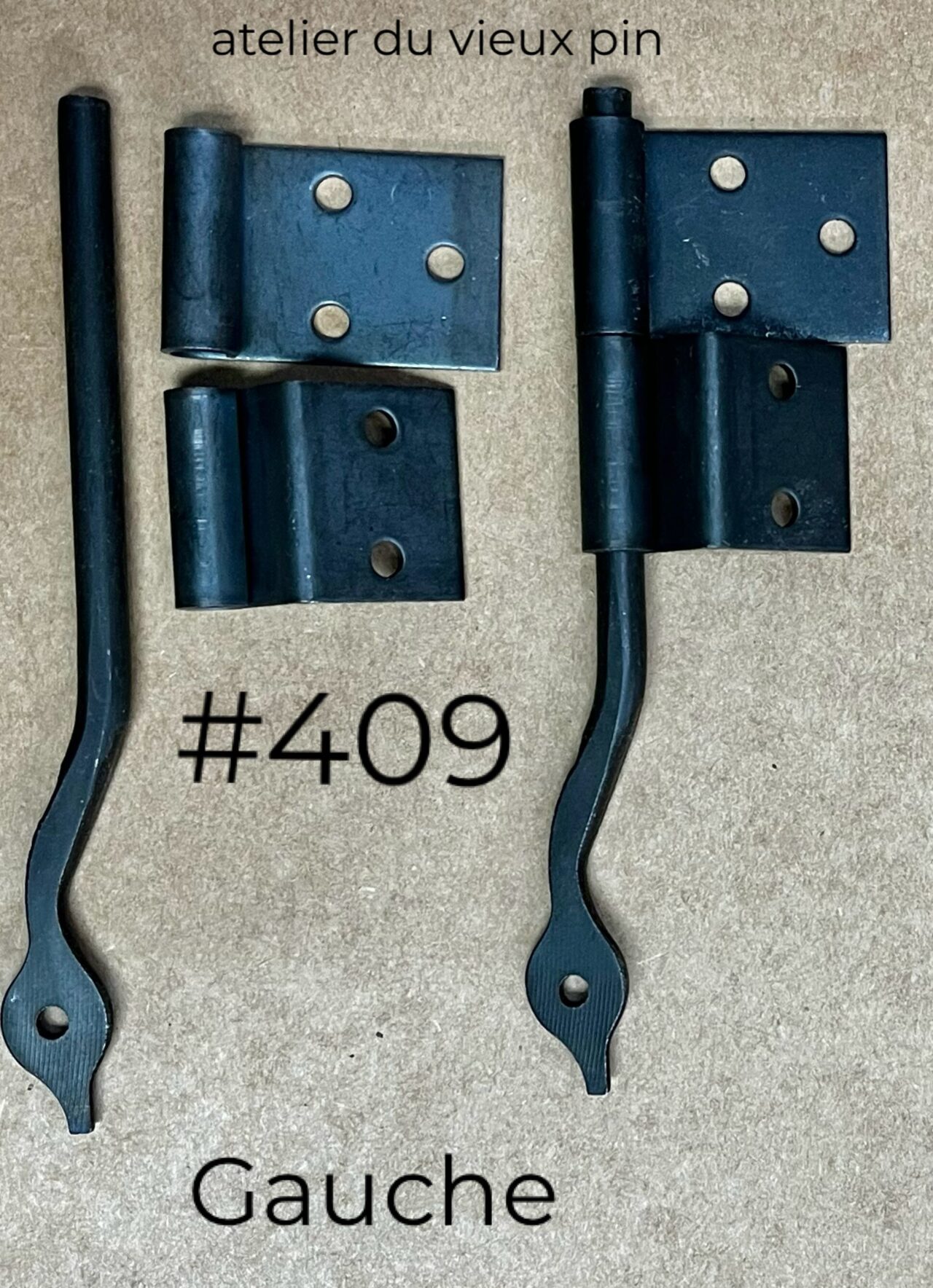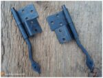 Queue-de-rat au fini noir oxydé. Ce modèle est utilisé pour une porte qui s’appuie sur le corps du meuble.