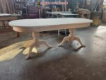 No d’item : TAB-024 Magnifique table avec pieds à Trétaux, un plateau oval et une jolie ceinture à cordon. Présentez-vous à la boutique de l’Atelier du vieux pin pour faire votre choix. Quincaillerie décorative et finition à l’ancienne. DIMENSIONS : 96 » Long x 39 » Large x 30 » Haut.
