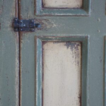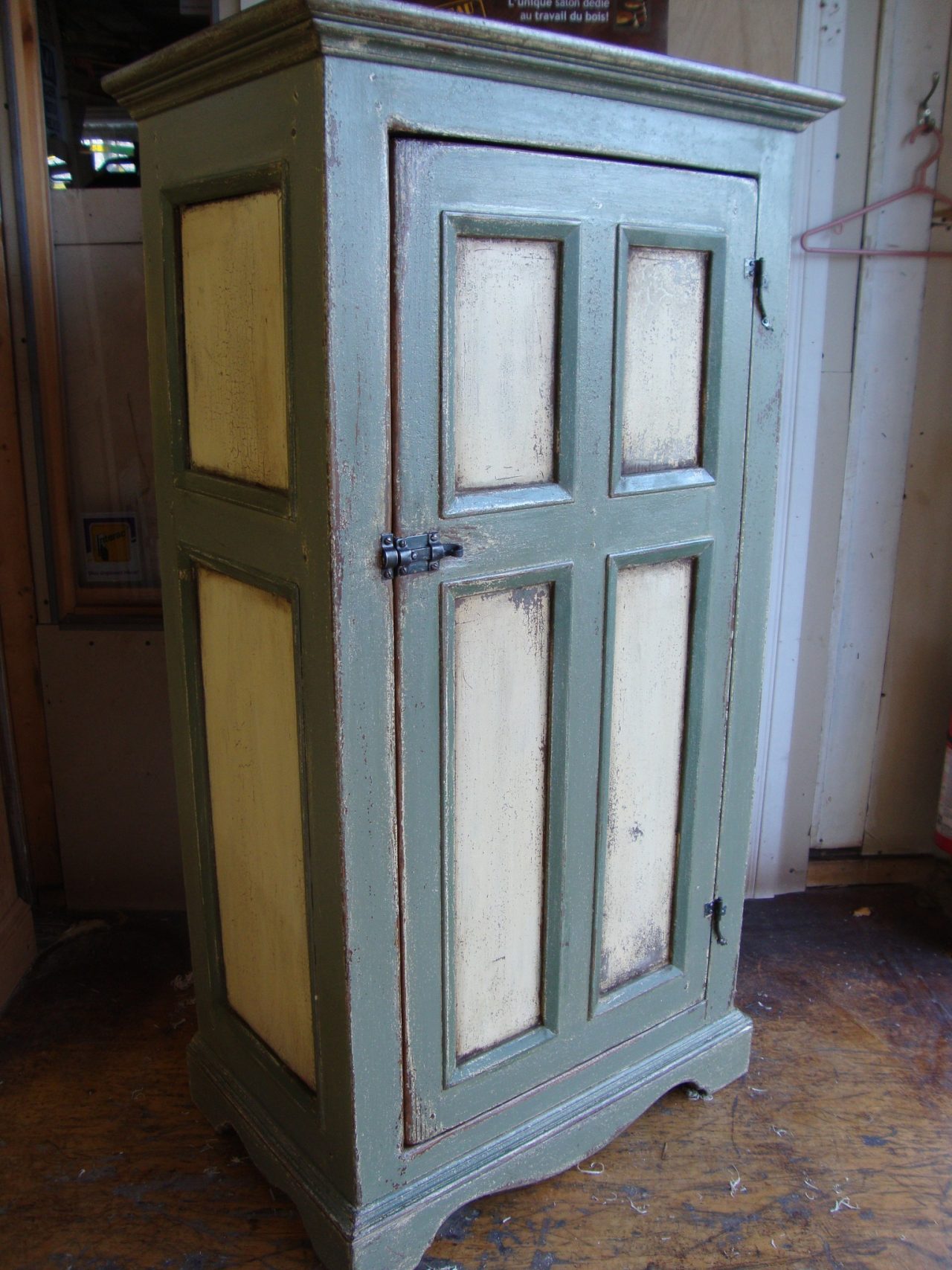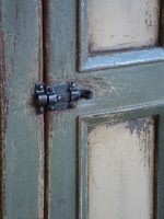 Verrou de fer forgé à queue retroussée pour sécuriser une porte dans le corps du meuble.