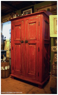 No d’item : ARM-033 Armoire avec une finition rouge ardente, construite avec deux portes dans le corps. Huit panneaux creux à mouluration épurée ajoutée. Quatre tablettes ajustables sur crémaillères. Présentez-vous à la boutique de l’Atelier du vieux pin pour faire votre choix. Chacune de nos armoires sont confectionnées en atelier avec notre quincaillerie décorative et notre procédé de finition à l’ancienne. DIMENSIONS : 18 » P x 33 » L x 58 » H