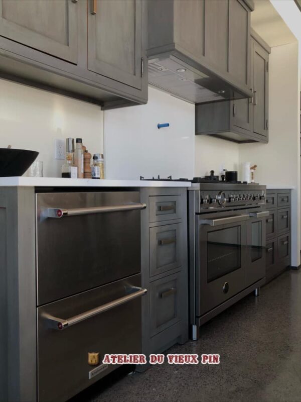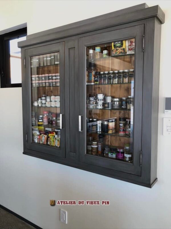 No d’item : CUI-059 Présentez-vous à la boutique de l’Atelier du vieux pin pour faire votre choix. Toutes nos armoires de cuisine sont confectionnées en atelier avec notre quincaillerie décorative et notre procédé de finition à l’ancienne. DIMENSIONS : Selon vos besoins.