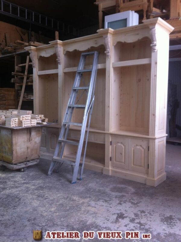 No d’item : BIB-008 Bibliothèque trois sections sur mesure avec échelle. Présentez-vous à la boutique de l’Atelier du vieux pin pour faire votre choix. Toutes nos bibliothèques sont confectionnées en atelier avec notre quincaillerie décorative et notre procédé de finition à l’ancienne. DIMENSIONS : 15 » P x 108 » L x 90 » H
