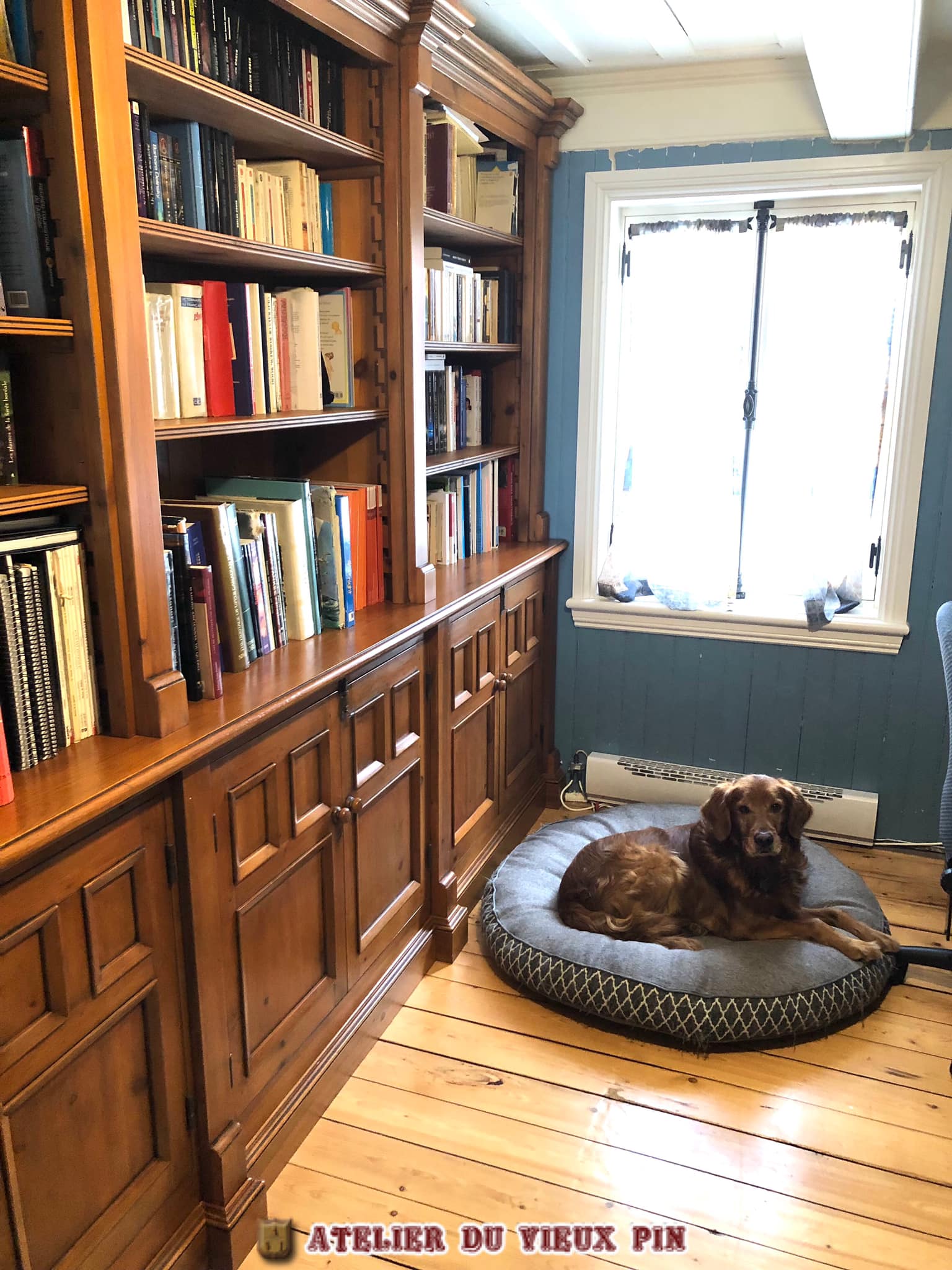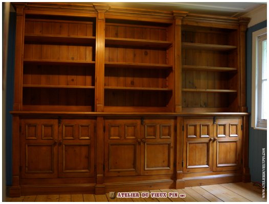 No d’item : BIB-018 Bibliothèque deux corps à trois sections. Six portes à panneaux creux dans le coprs. Elle possède des tablettes ajustables sur crémaillères, une jolie corniche et bien plus encore. Présentez-vous à la boutique de l’Atelier du vieux pin pour faire votre choix. Toutes nos bibliothèques sont confectionnées en atelier avec notre quincaillerie décorative et notre procédé de finition à l’ancienne. DIMENSIONS : Selons vos disponibilités.