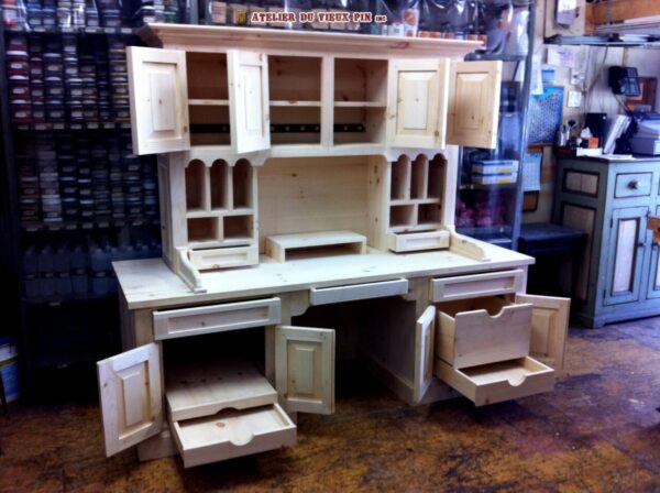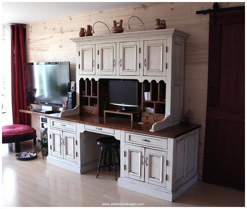 No d’item : BIB-005 Bureau de travail et rangement multiples. Présentez-vous à la boutique de l’Atelier du vieux pin pour faire votre choix. Tout notre mobilier sur mesure est confectionnée en atelier avec notre quincaillerie décorative et notre procédé de finition à l’ancienne. DIMENSIONS : Selon vos spécifications.