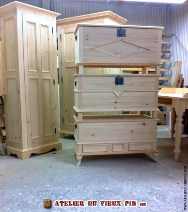 No d’item : COF-013 Superbe coffre en pin à mouluration en forme de V. Pentures intérieures, poignées et serrure en fer martellé. La courroie intérieure de soutien est en cuir. Présentez-vous à la boutique de l’Atelier du vieux pin pour faire votre choix. Tous nos coffres sont fabriqués en atelier avec notre quincaillerie décorative et notre procédé de finition à l’ancienne. DIMENSIONS : 19 » P x 36 » L x 20 » H.
