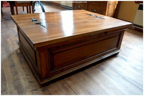 No d’item : COF-016 Coffre rectangulaire avec serrures. Quatre panneaux soulevés à mouluration ajoutée. Abattant avec courroie de soutien en cuir. Présentez-vous à la boutique de l’Atelier du vieux pin pour faire votre choix. Tous nos coffres sont fabriqués en atelier avec notre quincaillerie décorative et notre procédé de finition à l’ancienne. DIMENSIONS : 36 » P x 46 » L x 17 » H.