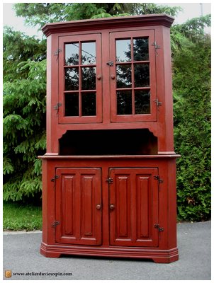 No d’item : ENC-004 Encoignure deux morceaux à quatre portes dans le corps du meuble avec dormants. Quatre panneaux soulevés à plis de serviette et portes vitrées à douze carreaux indépendants. Présentez-vous à la boutique de l’Atelier du vieux pin pour faire votre choix. Toutes nos encoignures deux morceaux sont fabriquées avec notre quincaillerie décorative et notre procédé de finition à l’ancienne. DIMENSIONS : 27 » P x 27 » L x 36 » H et 25 » P x 25 » L x 48 » H.