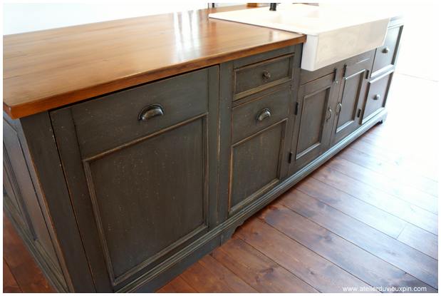 No d’item : CUI-030 Présentez-vous à la boutique de l’Atelier du vieux pin pour faire votre choix. Toutes nos cuisine sont confectionnées en atelier avec notre quincaillerie décorative et notre procédé de finition à l’ancienne. DIMENSIONS : Selon vos besoins.