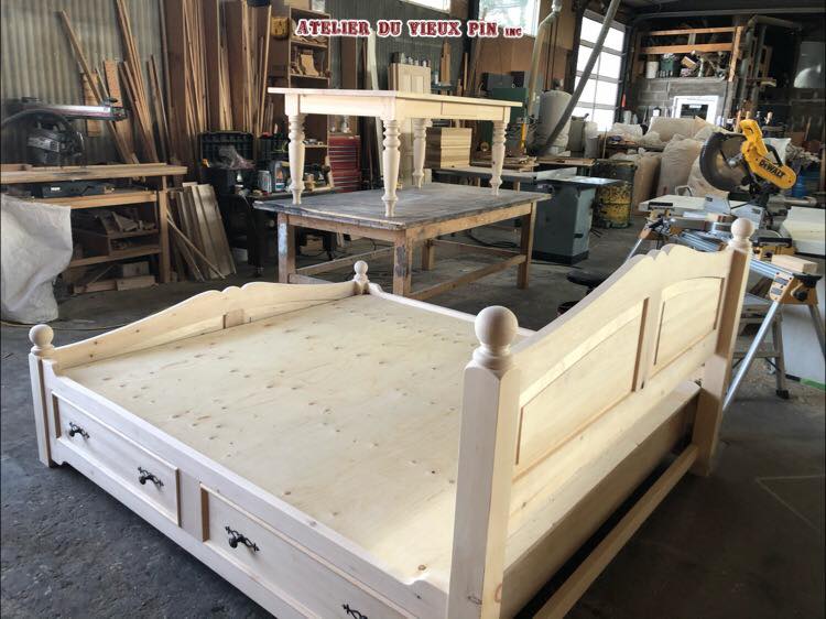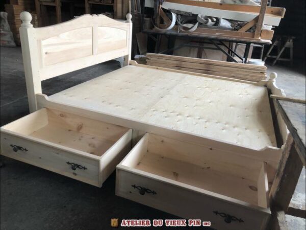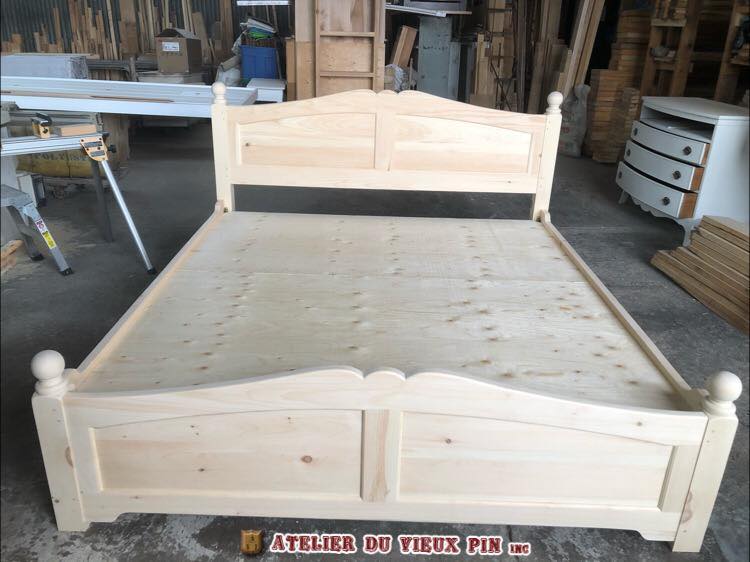 No d’item : LIT-010 Lit à panneaux avec quatre colonnes couronnés de boules aux extrémités. Quatre tiroirs et structure démontable pour favoriser les déplacement. Présentez-vous à la boutique de l’Atelier du vieux pin pour faire votre choix. Tous nos lits à colonnes sont fabriqués avec notre quincaillerie décorative et notre procédé de finition à l’ancienne. D’autres formats de lit sont également disponibles. DIMENSIONS : 84-1/2 » Largeur x 76-1/2 » Longueur et 23-1/4 » & 43-1/4 » Hauteur.