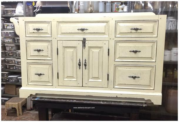 No d’item : VAN-021 Petite vanité à six tiroirs progressifs ainsi qu’une façade basculante. Et deux portes à panneaux soulevés avec mouluration ajoutée. Tiroirs à pleine ouverture avec fermeture à ralentissement. Présentez-vous à la boutique de l’Atelier du vieux pin pour faire votre choix. Toutes nos vanités sont confectionnées en atelier avec notre quincaillerie décorative et notre procédé de finition à l’ancienne. DIMENSIONS : 21 » P x 58 » L x 34 » H.