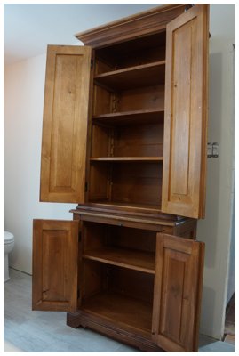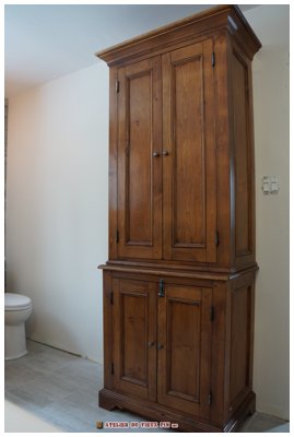 No d’item : VAN-022 Cabinet et rangement divers sur mesure pour la salle de bain. Présentez-vous à la boutique de l’Atelier du vieux pin pour faire votre choix. Tous nos meubles sont confectionnés en atelier avec notre quincaillerie décorative et notre procédé de finition à l’ancienne. DIMENSIONS corps du bas : 18 » P x 30 » L x 34 » H. DIMENSIONS corps du haut: 16 » P x 30 » L x 51 » H