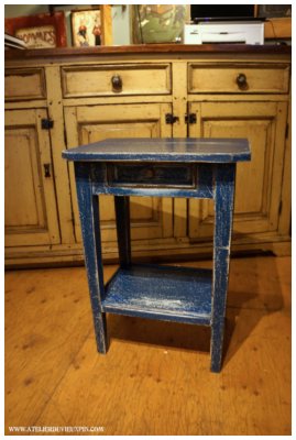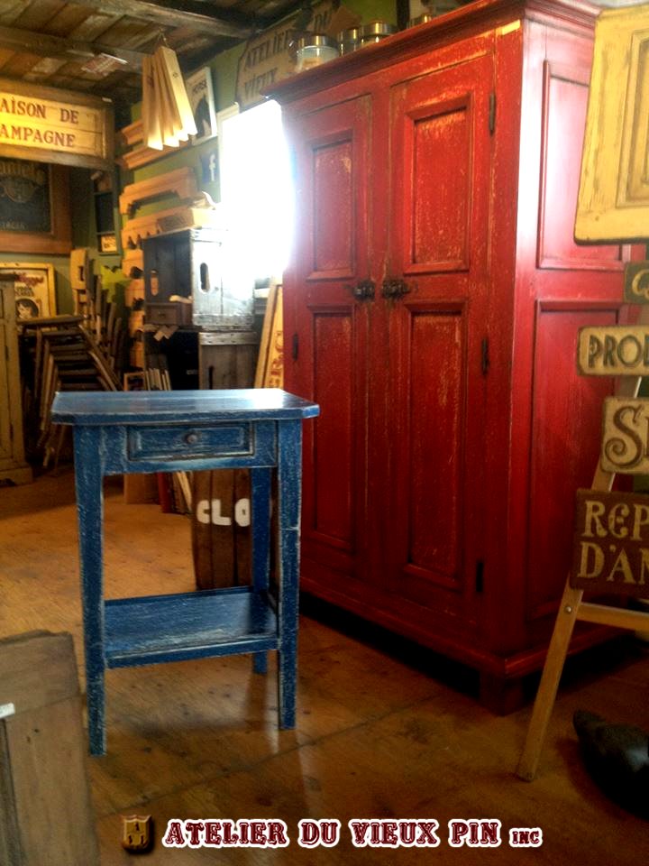 No d’item : TDN-008 Table de nuit bleue avec petit tiroir et pattes carrées. Présentez-vous à la boutique de l’Atelier du vieux pin pour faire votre choix. Toutes nos tables de nuit en pin sont confectionnées en atelier avec notre quincaillerie décorative et notre procédé de et finition à l’ancienne. DIMENSIONS : 16 » P x 20 » L x 27 » H.