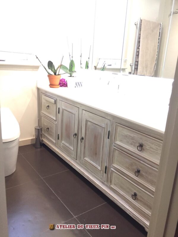 No d’item : VAN-020 Vanité à deux portes et trois tiroirs dans le corps du meuble. Huit panneaux creux à mouluration ajoutée ainsi que deux porte-serviettes. Présentez-vous à la boutique de l’Atelier du vieux pin pour faire votre choix. Toutes nos vanités sont confectionnées en atelier avec notre quincaillerie décorative et notre procédé de finition à l’ancienne. DIMENSIONS : 18  » P x 88  » L x 34  » H.